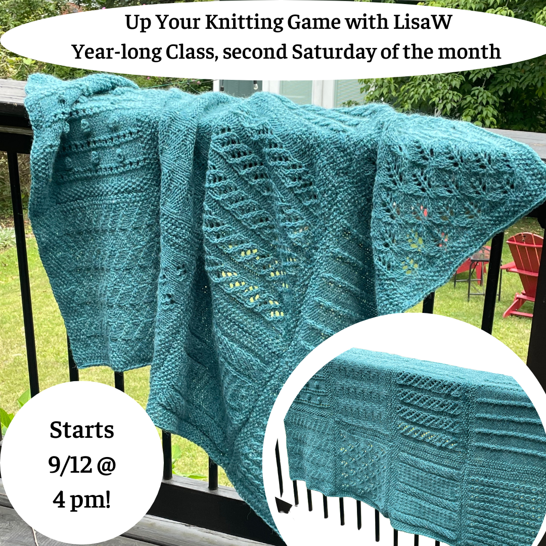 Up Your Knitting Game 2024 - 25 is a year-long Building Blocks Class (using the Building Blocks book by Michelle Hunter) taught by Lisa W. that meets for 1.5 hours the second Saturday of every Month starting 9/14/23 at 4 p.m. Price includes the Building Blocks book. Additional yarn purchase required.